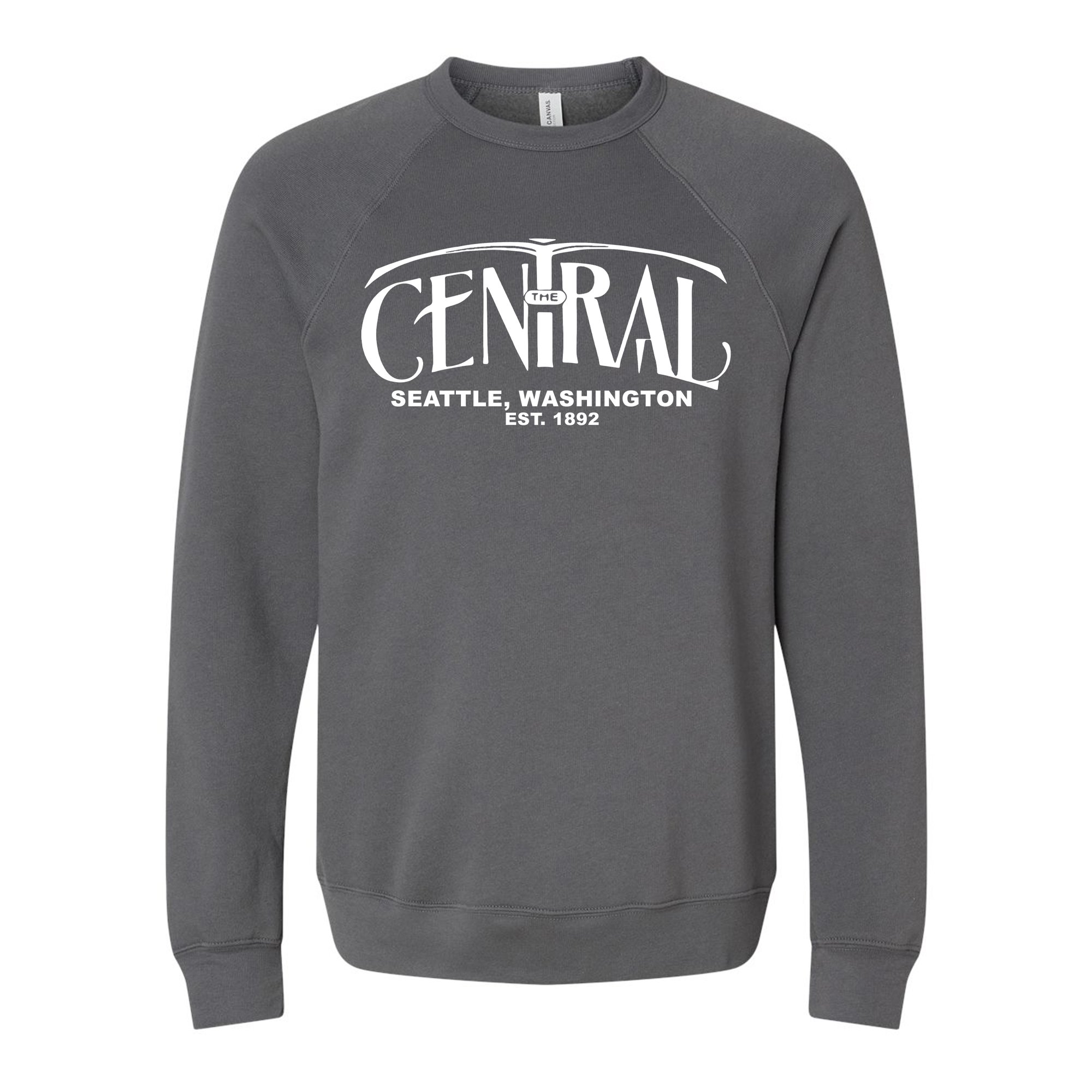 White Central Pickaxe Logo on Asphalt Unisex Sponge Fleece Raglan Crewneck Sweatshirt.